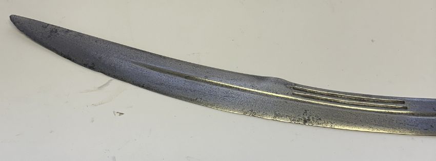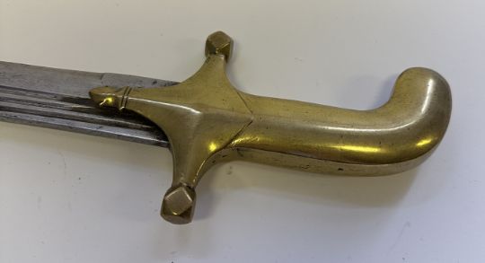 with curved blade (some old pitting) cut with five pairs of slender fullers along the back on each side above a slender central fuller extending into the double-edged point with shallow yelman, heavy copper-alloy hilt comprising quillon-block with pointed terminal over the forte on both sides, short quillons each with multi-faceted terminal, and rounded grip curved at the pommel, 73.3 cm blade