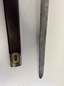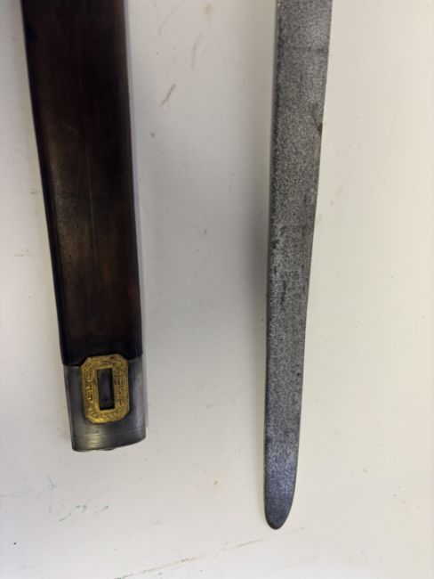 with broad slightly tapering double-edged blade incised with two man-in-the-moon marks on both sides, the forte cut with three central narrow fullers over both sides, one side incised ‘+SANCTISIMA MARYA+’, and on the other with a crucifix supported by clouds, a rising sun above, iron hilt comprising disc-shaped guard, pointed rear quillon and stirrup knuckle-guard in one, flat pommel-cap and back-piece, the latter with basal ferrule, and cord-bound leather-covered grip, in modern wooden scabbard covered in brown leather lightly tooled on the outside and with steel chape and suspension mounts each with applied gilt-metal key-pattern mount on the outside, and two rings for suspension, 81.8 cm blade