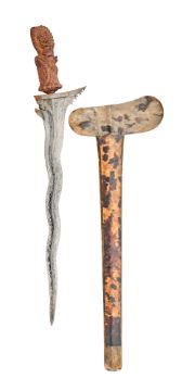 with tapering double-edged six lok pattern-welded blade with medial ridge along both sides, characteristic waved ganja, and wooden grip (mendak missing) carved in the round as a seated figure of Bhuta-Nawa-Sari, in its wooden scabbard faced in turtle shell and with characteristically shaped wranka, 42.4 cm blade