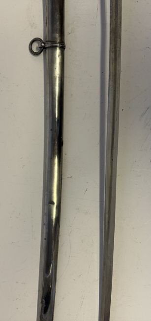 of regulation pattern, with slightly curved blade with etched decoration, in its polished steel scabbard with suspension rings (some old denting, wear and light pitting overall), 89.8 cm blade