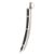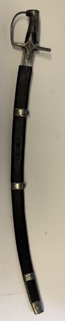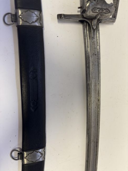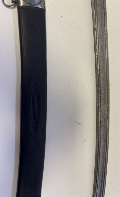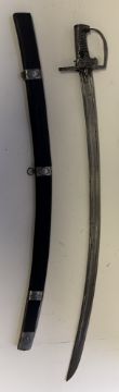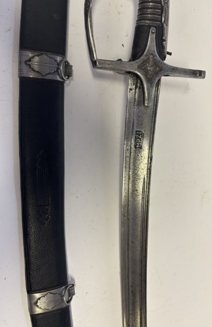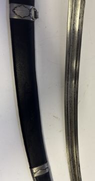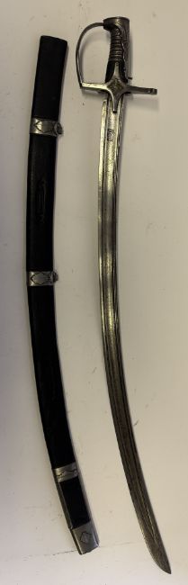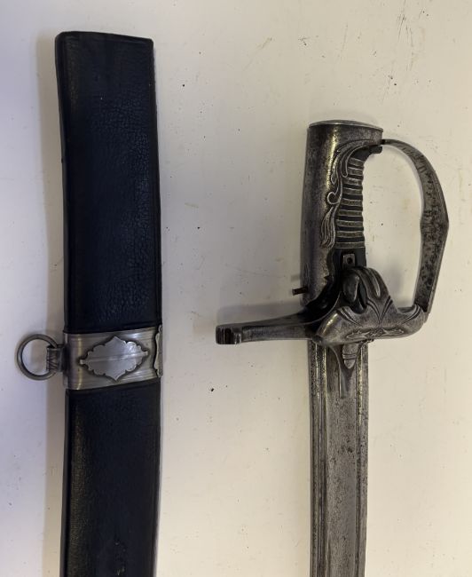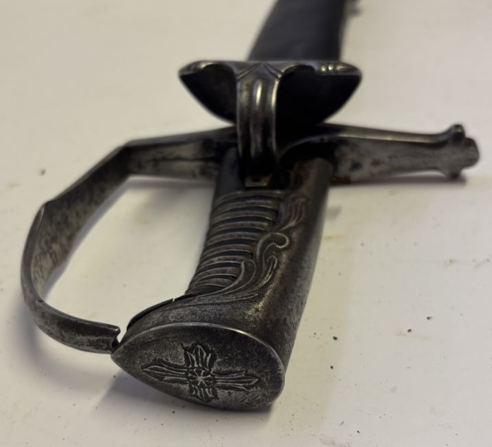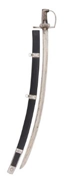 with curved fullered blade (light pitting) double-edged towards the point, the forte fluted along the back and deeply etched ‘MPZI’ on one side, stirrup-hilt cast with foliate designs and comprising blunt tapering langets (applied quatrefoil missing) with shaped partly fluted thumb-ring on the inside, flat rear quillon with trefoil-shaped terminal, integral knuckle-guard, ovoidal pommel-cap and shaped back-piece in one, and leather-covered grip partly bound with punched silver ribbon, in its wooden scabbard covered in black leather tooled on the outside and with steel mounts set with cartouche-shaped panels, the suspension mounts each with a ring for suspension, 87.5 cm blade