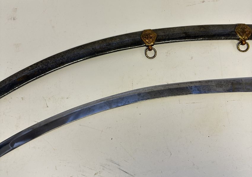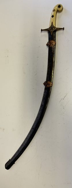 with bright curved fullered single-edged blade etched in both sides of the forte with the regimental badge of the 2nd Bengal Lancers, hilt with gilt copper-alloy mounts comprising guard cast and chased with a floret on both sides against a finely punched ground, the quillon tips each chased with a flower-head, grip-strap chased with a line of quatrefoils, and ivory grip-scales pierced with a hole for a sword-knot and with two florets on each side, in its silvered scabbard chased overall with flowering foliage (some old damage) and gilt copper-alloy suspension mounts each with a ring for suspension (gilding worn), 78.0 cm blade