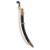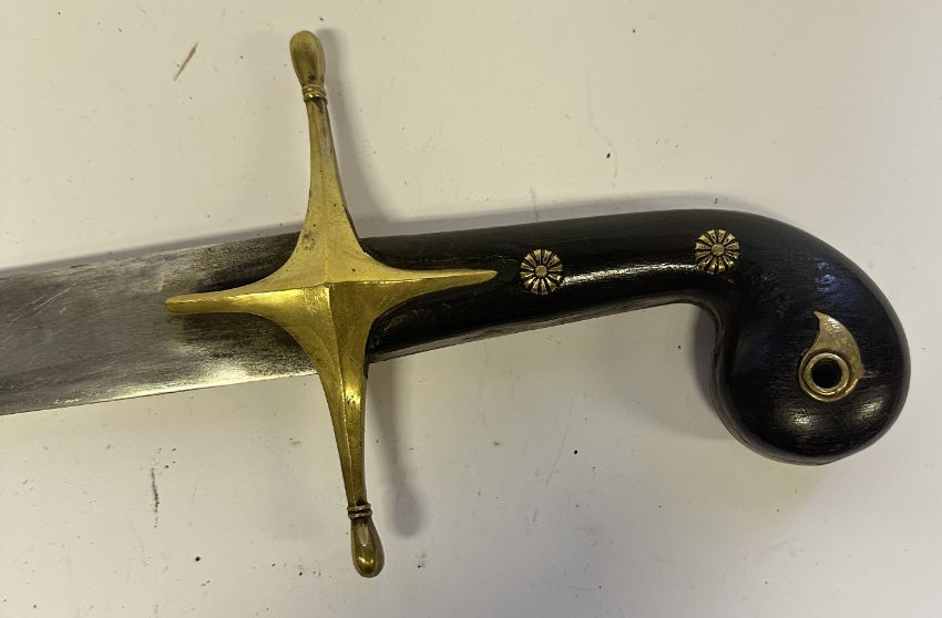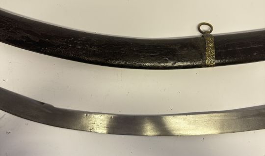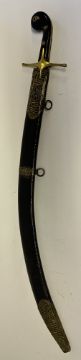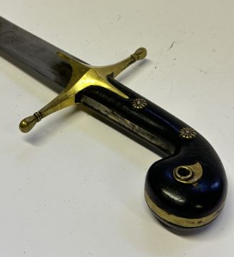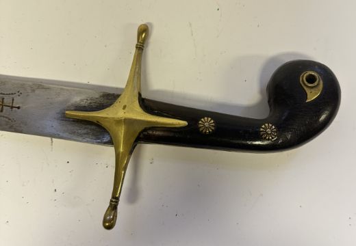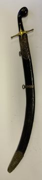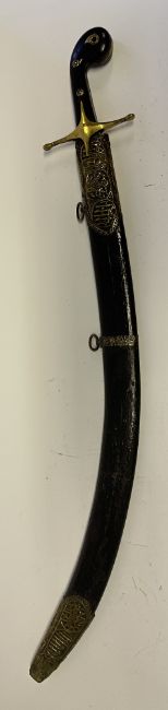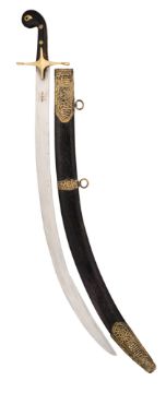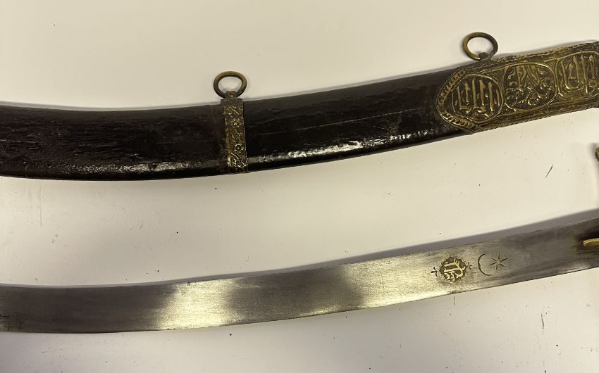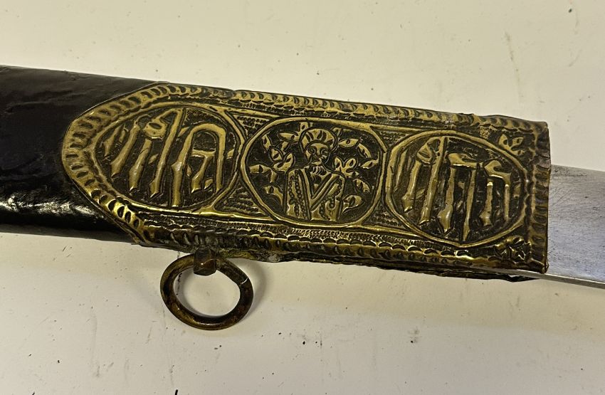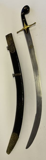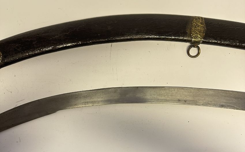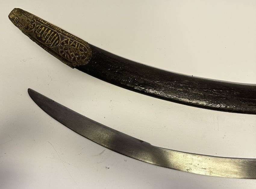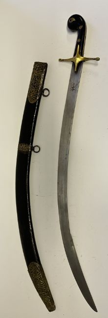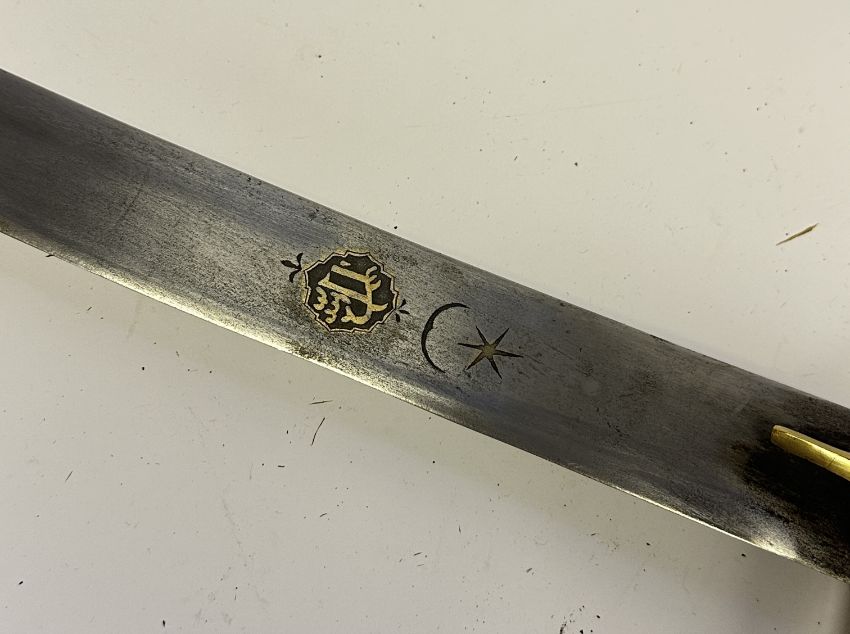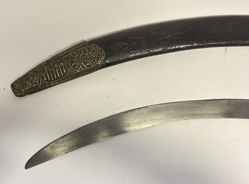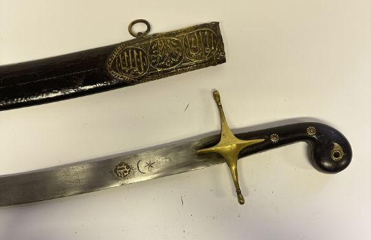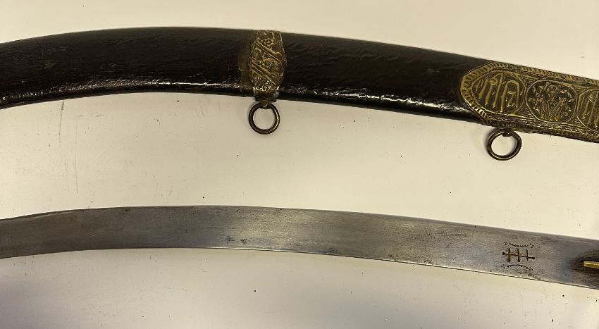 with curved blade double-edged to the point in front of the shallow yelman, the forte incised with a mark between etched ‘eyelash’ marks on one side, and with etched lightly gilt calligraphic cartouche, crescent moon and star on the other, copper-alloy mounted hilt comprising faceted quillon-block with pointed langets and tapering quillons, the latter each with bud-shaped terminal, grip-strap, and wooden grips with rounded pommel and secured by two transverse rivets on small petalled washers, the pommel with copper-alloy mounted circular hole for a tassel, in original blackened wooden scabbard with copper-alloy locket and chape embossed on each side with roundels enclosing a portrait bust, calligraphy and a stylised animal, suspension mount embossed with flower-heads, and with two rings for suspension, 81.5 cm blade