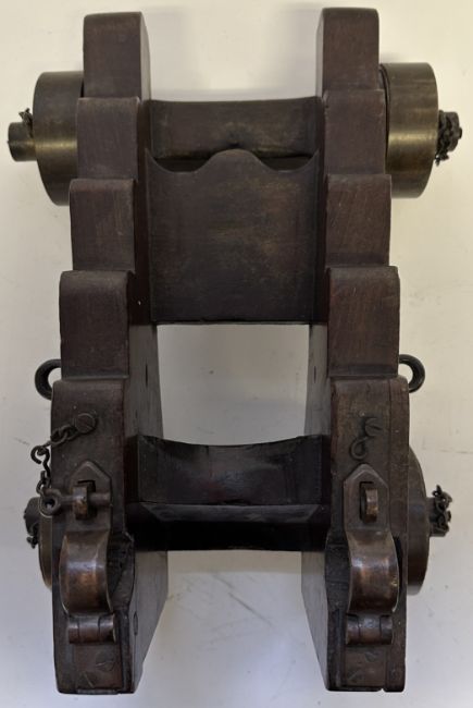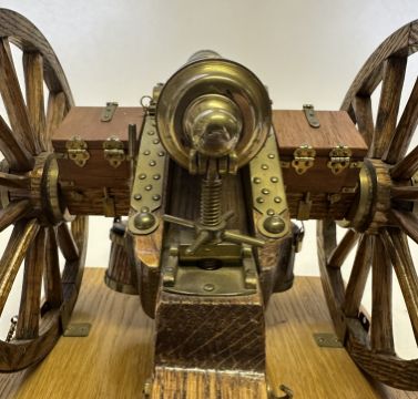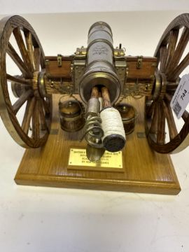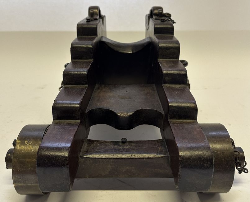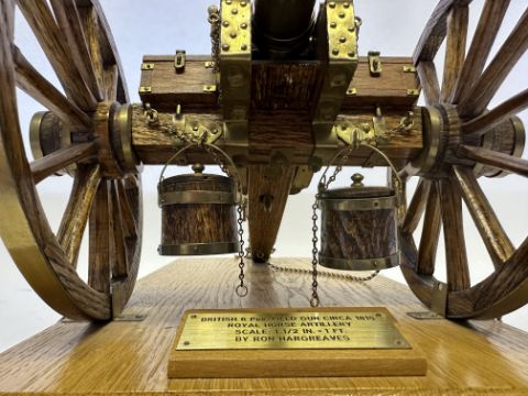 the first of wood and of stepped form, with copper-alloy hinged trunnion caps, one retaining its securing bolt, restraining rings, and turned wooden trucks with copper-alloy mounts and chained securing pins; the second well-constructed in a scale of 1 1/2 in to 1 ft, the multi-stage bronze barrel cast with crowned cypher and motto of George III and crowned ‘M’ in a wreath of Henry, 1st Earl of Mulgrave, on oak wheeled carriage with copper-alloy mounts: on a wooden plinth with plaque marked ‘BRITISH 6 PDR GUN CIRCA 1815 ROYAL HORSE ARTILLERY SCALE: 1 ½ IN. = 1 FT BY RON HARGREAVES’ (2)