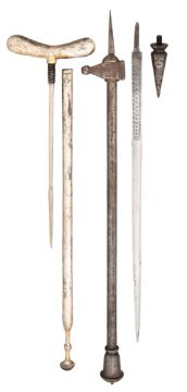 the first of silvered iron, with head of curved rounded section swelling at each end, threaded at the base and opening to reveal a blade of diamond section reinforced at the point, on seamed tubular haft with waisted terminal, the latter with central moulding and large button-shaped terminal; the second of iron, with block-shaped head drawn-out at the rear to form a cushion-shaped threaded peen, and with threaded spike of diamond section on a dome-shaped mount, and tubular haft with urn-shaped terminal; the last comprising a threaded spike of tapering circular section damascened overall with flowering foliage, and a blade with punched decoration on both sides over the forte, in a modern fabric-covered scabbard, the first: 28.5 cm blade (4)