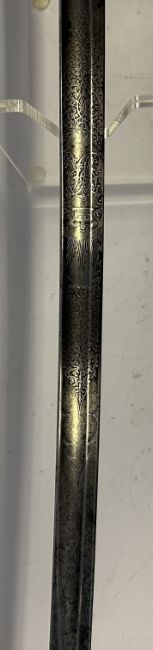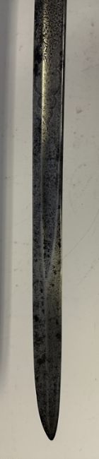 of regulation pattern, with slightly curved etched fullered blade including owner’s initials ‘WFH’, the back etched ‘TAKEN FROM THE WELL AT CAWNPORE AFTER THE RECAPTURE OF THAT CITY BY THE BRITISH’, steel hilt incorporating a crowned slung bugle in an oval, and wire-bound fishskin-covered grip (old rust patination and some pitting), 68.5 cm blade