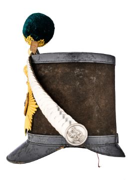 the cylindrical body with black silk felt covering and black leather flat top and slightly drooping peak, tapering circular white-metal chin-scales, green pompom in an ornate gilt socket, large crowned gilt rayed plate mounted with a frosted gilt bugle-horn with fine white-metal rose in the curl, pale leather headband and crimson silk lining (possibly replaced) bearing label for Hawkes & Moseley, 14 Piccadilly, in good condition