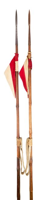 each with steel tip (one with surface rust) of hollow triangular section and integral socket of tapering circular section, each on its tapering bamboo haft with leather grip and buff-leather strap, conical iron shoe, and red and white fabric pennant, approximately 255.0 cm long (2)