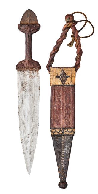 with double-edged leaf-shaped blade incised with converging lines over each side and incised at a later date with an inscription to De Witt Bailey dated February 18 1868, the forte on both sides with incised geometric ornament, grip wrapped with interlaced leather thongs and with russet flat arched pommel, in its leather scabbard with tooled decoration and twisted leather suspension strap with button fastener, and in fair condition, 22.5 cm blade