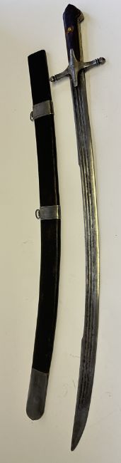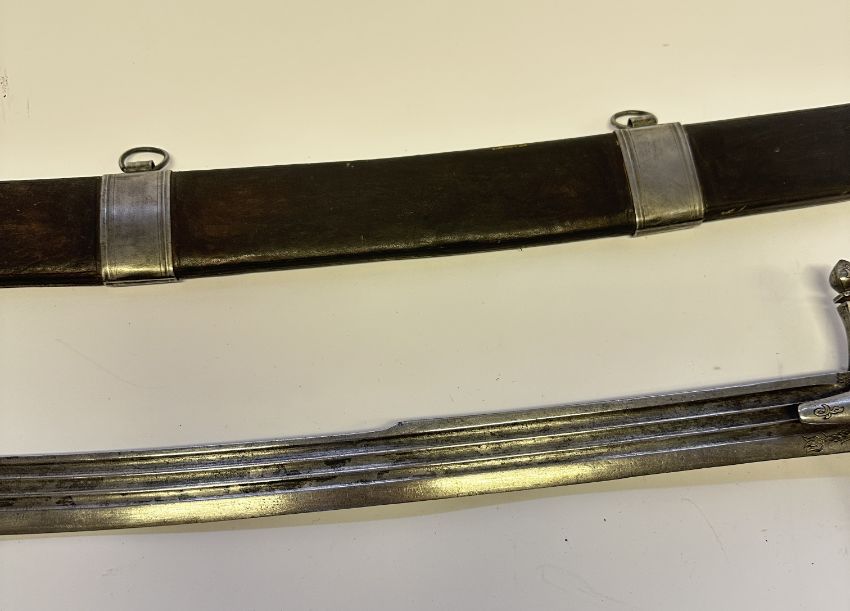 with slightly curved fullered blade with shallow recess along the back over much of its length to the yelman in front of the double-edge point, and engraved with silvered foliage on both side at the forte, hilt comprising steel quillon-block decorated en suite with the forte on the langets and waisted quillons, the latter with bud-shaped terminals, copper-alloy grip-strap cast with laurel, and flat wooden grips beaked at the pommel, in modern wooden scabbard covered in black leather lightly tooled along the outside and with steel chape and suspension mounts with applied copper-alloy knotwork, and two rings for suspension, 80.0 cm blade