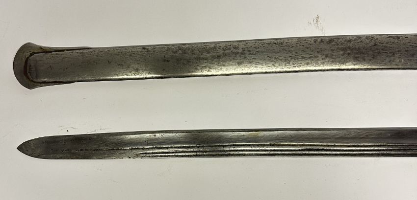 with earlier very slightly curved blade double-edged at the point and cut with three narrow fullers along the back over most of its length on both sides, the forte on one side incised ‘INTVO MOMINE + IEZV’, copper-alloy hilt of two bars swept-up to join the knuckle-guard, downcurved rear quillon with lobed terminal, pommel-cap and back-piece in one, and wire-bound leather-covered grip, in its steel scabbard (light rust patination) with two rings for suspension, one retaining its leather suspension strap with copper-alloy buckle cast with two lion-masks, 83.5 cm blade