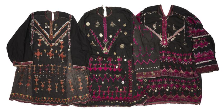 each decorated with silk embroidered geometric motifs, buttons, beads, coins, metal tokens and amulets (3)