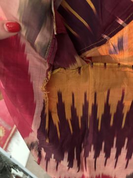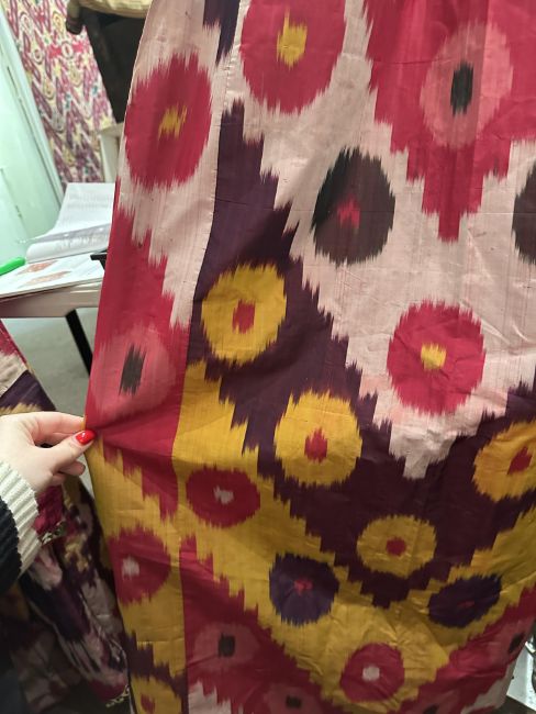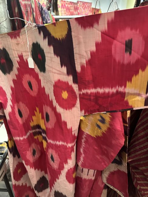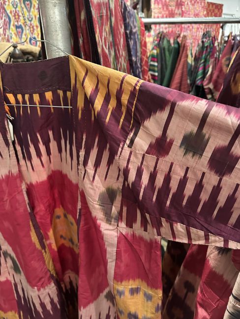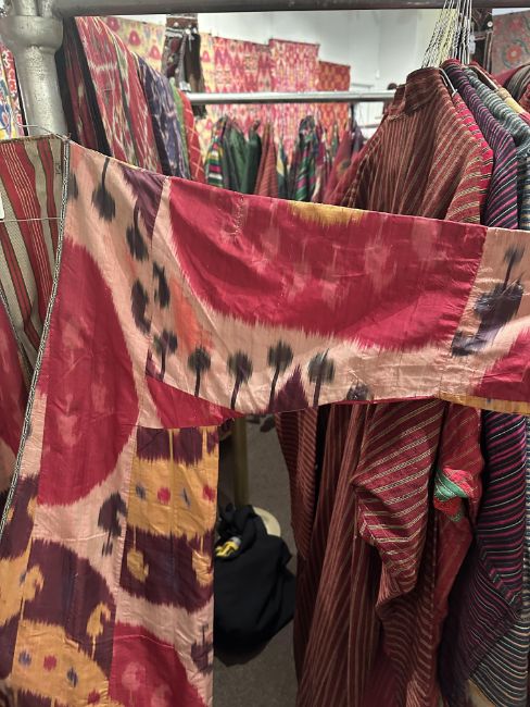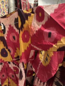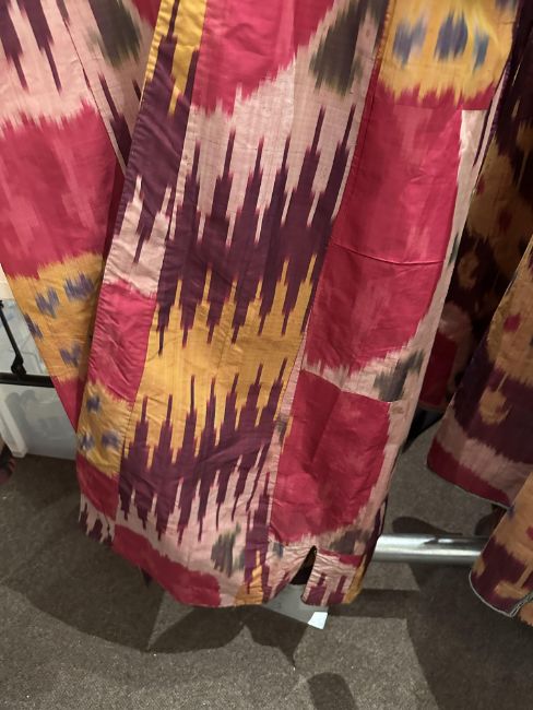 of atlas ikat, the munisak and one chapan unlined, one with printed cotton lining and braid trim, longest approximately 135cm (3)
