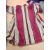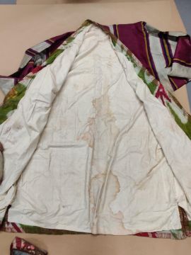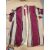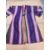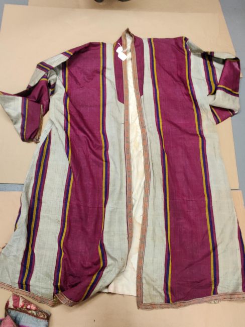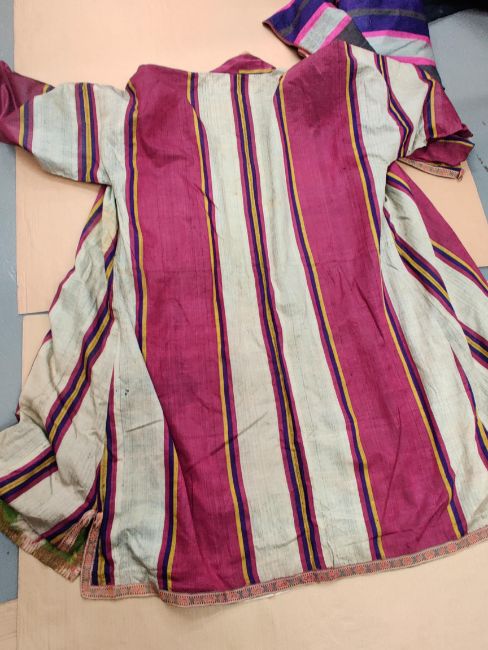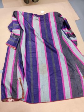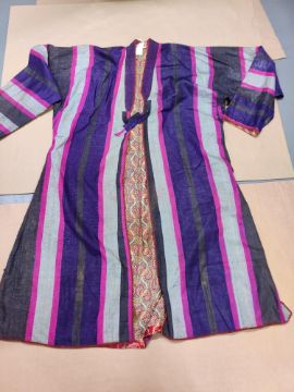 of glazed silk and cotton fabric, the first with broad ivory and crimson stripes, edged in yellow and purple, tablet braid edging, ikat facings, plain cotton lining, together with one in shocking pink, purple, silver and grey stripes, printed cotton lining with botehs, ikat facings, very narrow red braid edgings, tie front. approximate length 120cm (2)