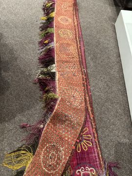 including an Uzbek embroidered panel fragment, together with another Suzani, an embroidered tent band and a pair of Tekke embroideries, the panel with a rose red ground embroidered with flower sprays, guls and leafy motifs, the suzani with leaf encircled motifs on a light camel ground, the tent band embroidered with roundels and with fringing, the Tekke panels finely worked with panelled star guls and geometric borders with fringing to all four sides, the embroidery approximately 140 x 170cm, the suzani approximately 240 x 180cm, the tent band 13cm deep, the Tekke panels each approximately 49 x 21cm excluding fringes (5)