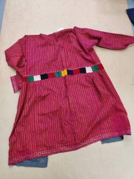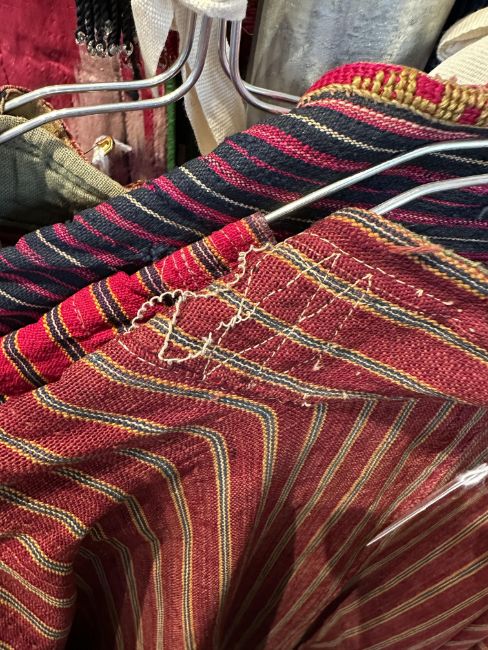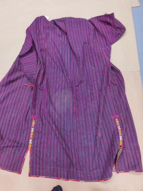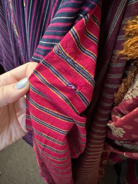 1st (far left in image) not purple as appears in additional photos, but has red & blue stripes, has mark on back (see photos) which has stiffened the fabric