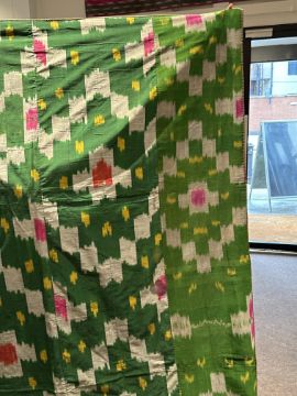 of adras ikat with green ground, pink and silvery grey cruciform motifs, approximately 242 x 138cm