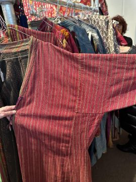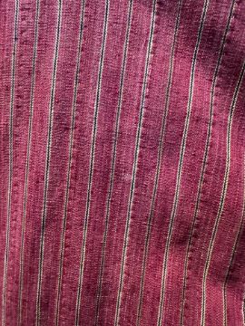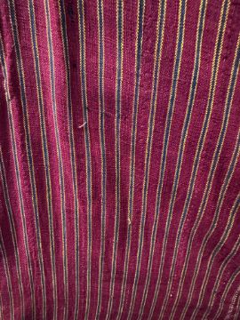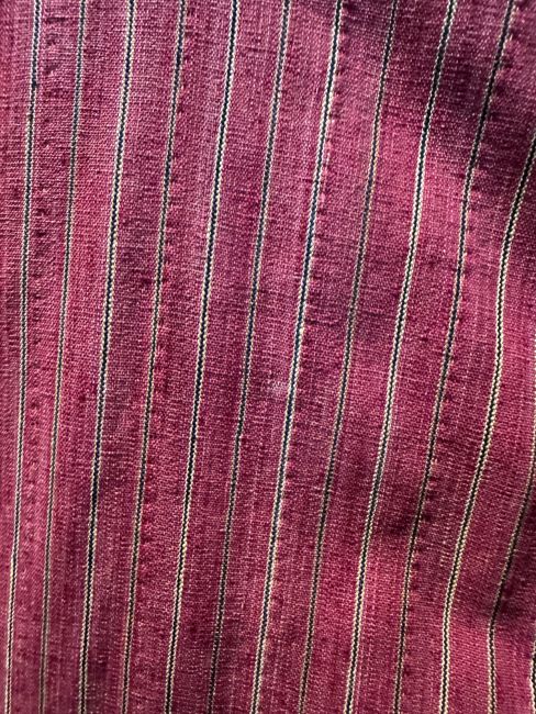 each of madder red plainweave with narrow black and yellow stripes, black floral printed linings, stripy facings, narrow braided edging, approximate length 120cm and 130cm (2)