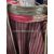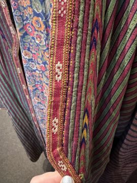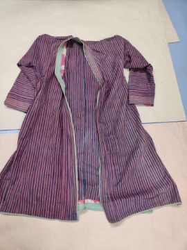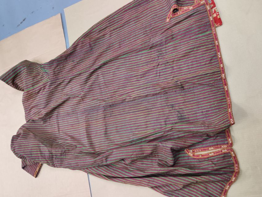 one of green and madder part silk striped plainweave, small floral printed cotton lining, elaborated tablet braid trim, the other of madder and indigo striped plainweave, printed cotton facings, both approximate length 115cm (2)