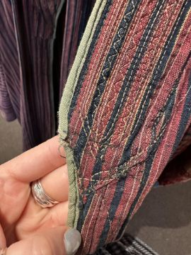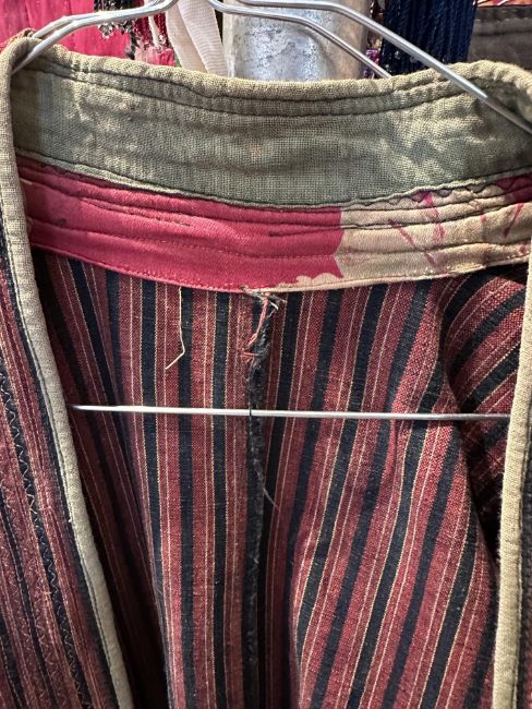 some minor discolouration, surface dirt, green and red striped examples with oily (?) black marks near hem, nice tablet braid and floral lining, loose threads on seams, some patches, generally fair condition
