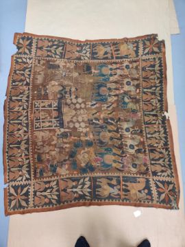 the larger with several losses to the applicque motif, lined, the second with patches to reverse, holes and losses, stains, both relatively fragile, the third with several large areas missing which have been patched in a plain pale madder cloth.