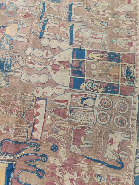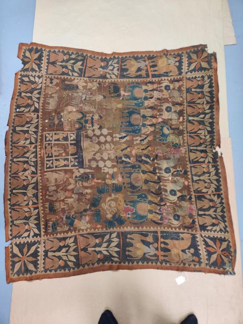 each worked in appliqué with a depiction of a shrine, surrounded by elephants, and armed mounted horsemen with shields and swords, with border of trees with couples standing beneath, losses and damage, approximately 120 x140cm; 125 x 125cm; 95 x 120cm (3)
