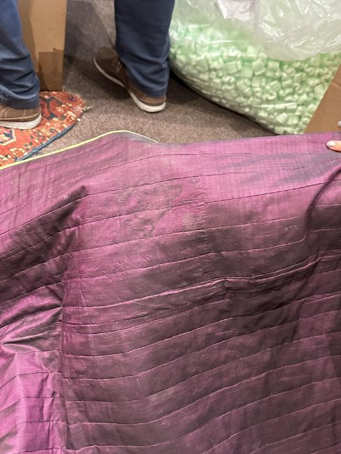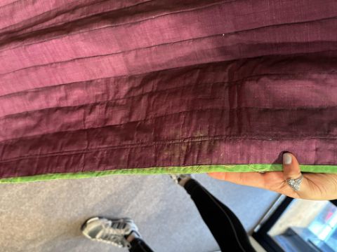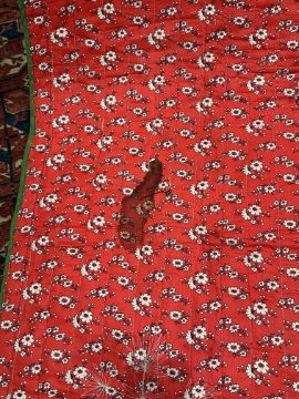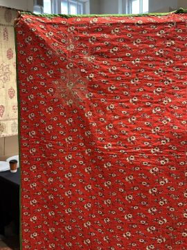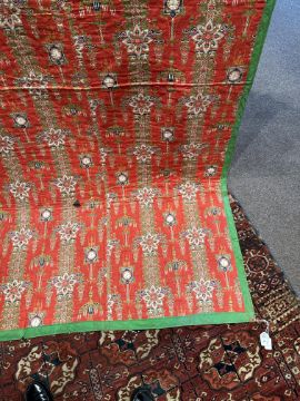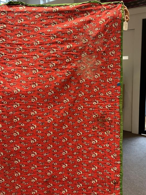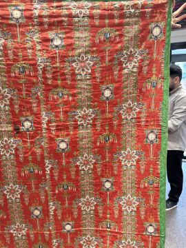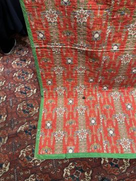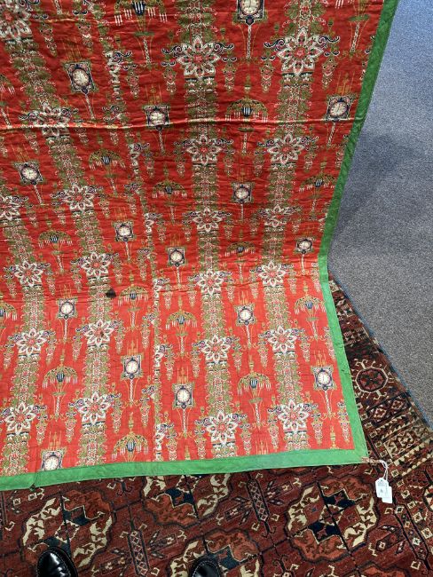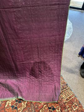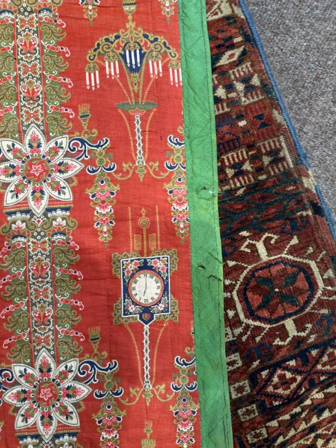 ikat with spotting and some colour transfer or colour run, marks to plain surround, printed cotton lining with some stained areas, plain quilt with some surface marks, some small splits where edge binding has pulled, generally good condition, printed cotton lining with clocks and candelabra