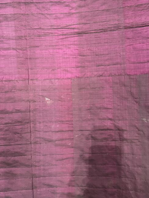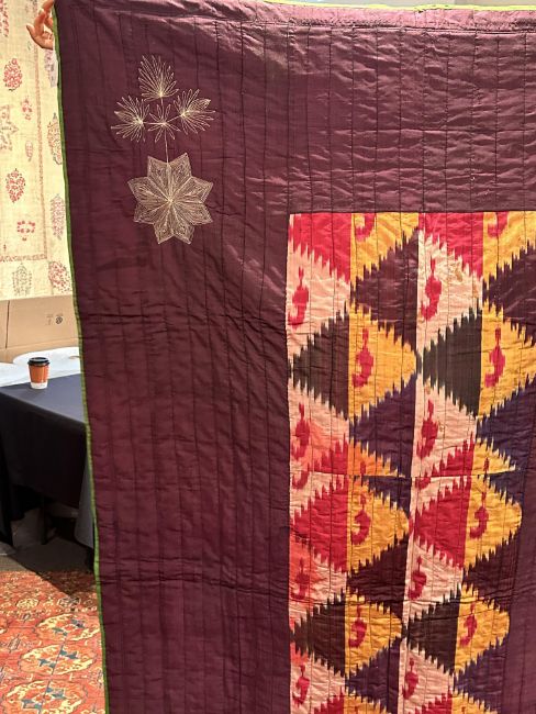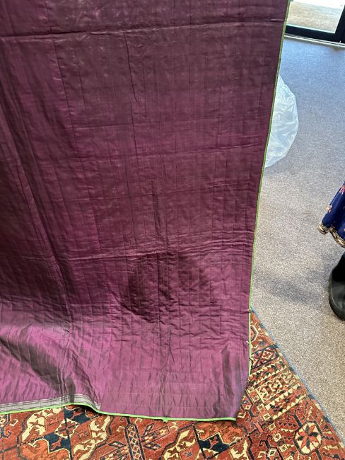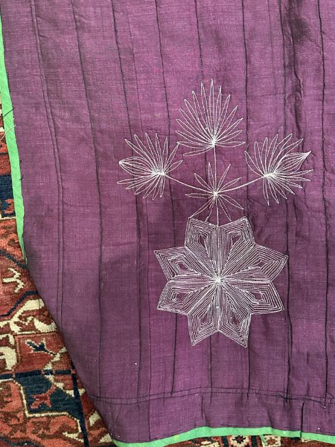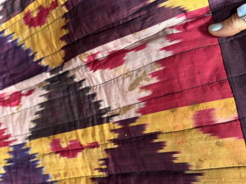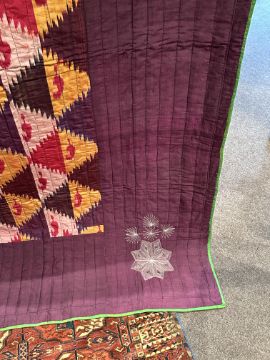 the first with a single loom width of atlas ikat in the central panel, pieced in the length, with interlocking polychrome feathered triangles and boteh, broad aubergine adras border, with floral embroidered decoration, approximately 212 x 124cm together with a plain aubergine silk quilted panel approximately 220 x 120cm (2)