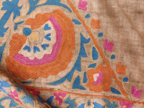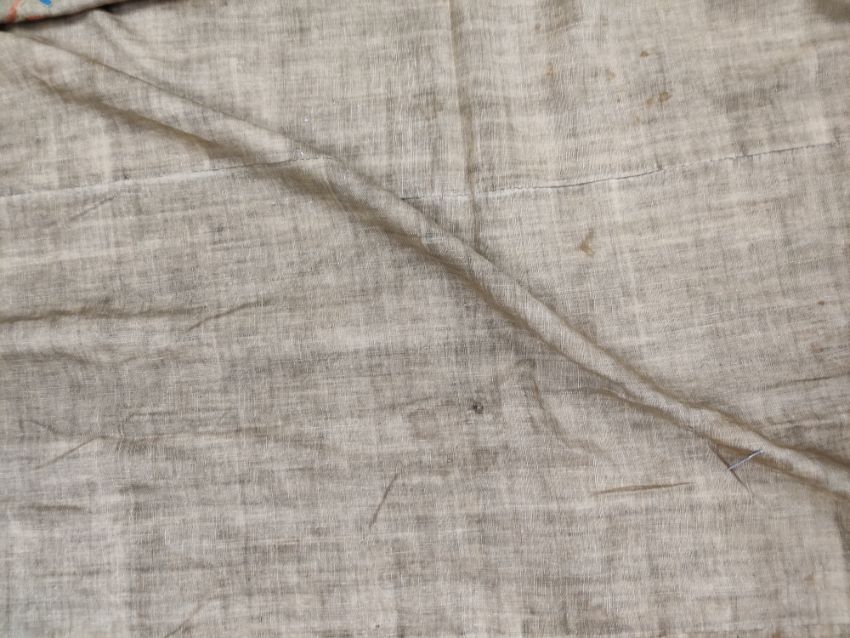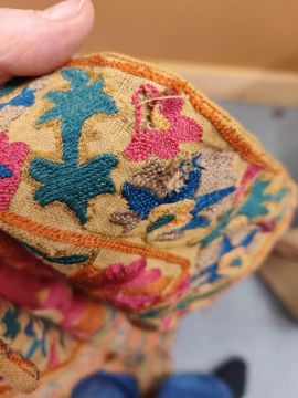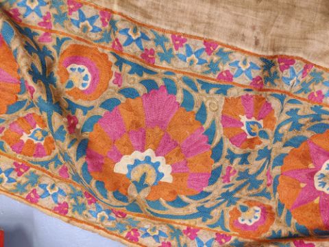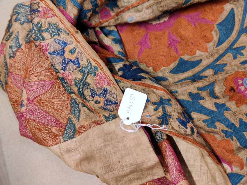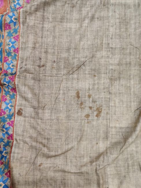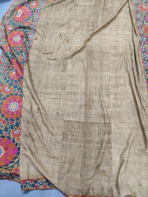 some spotting and staining to plain field which is a dark caramel, might benefit from a professional clean. Embroidery in good condition overall and of good quality and age.