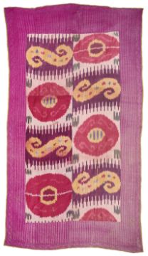 several splits to ikat, some wiht old tape glue marks, some with small patches, cobbled repairs, some watermarking and liquid stain approx 8 x 3cm, would benefit from some stabilisation, border faded - possibly fuchsine, some marks, printed cotton backing