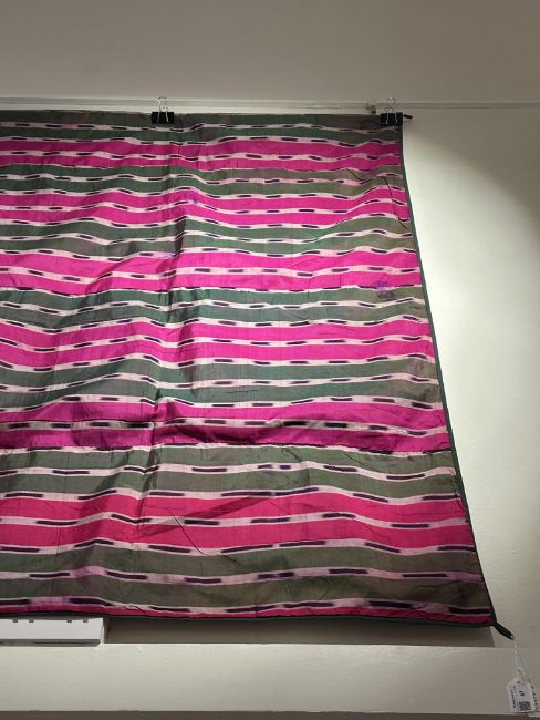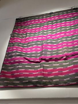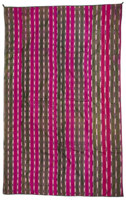 of atlas ikat in green, ivory and shocking pink stripes with purple flashes, approximately 200 x 128cm