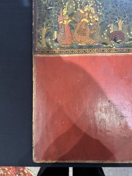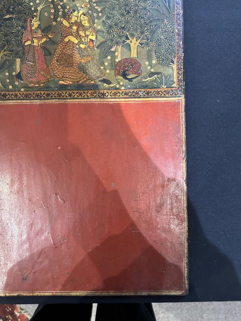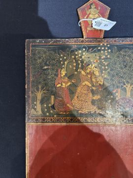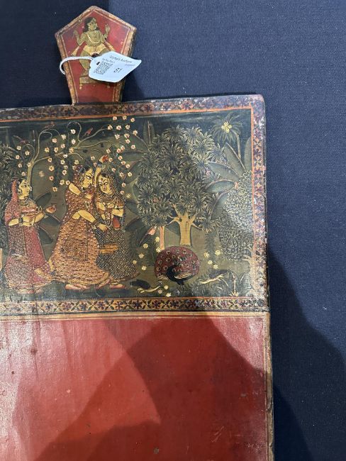 gouache with gold on wood, the rectangular panel with a painted scene of maidens in a forest at the top, the lower portion plain red, a pierced projection at the upper edge for hanging, depicting a youthful figure of Siva, 54 x 29.5 x 1cm