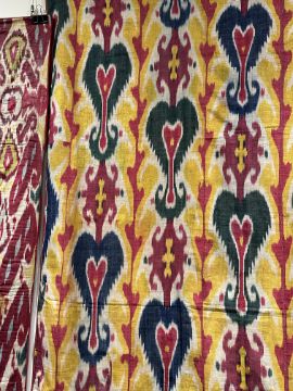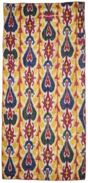 the glazed adras ikat with stems of large heart shaped palmettes and hooked flowerheads in yellow, crimson, indigo and forest green on ivory, approximately 220 x 100cm