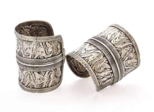 silver, of crescentic form, with twin bands of engraved arabesque decoration, 6 x 4 x 5cm