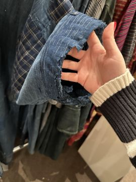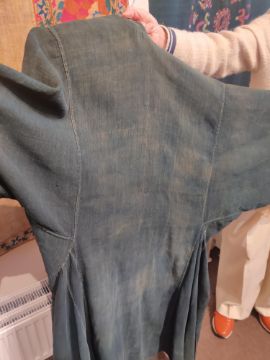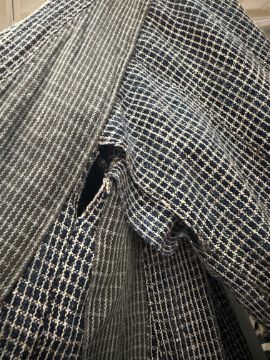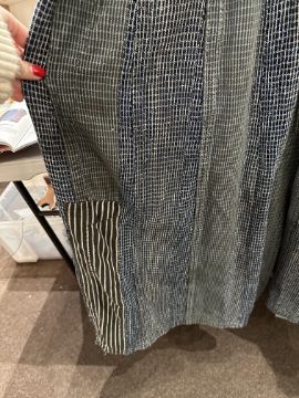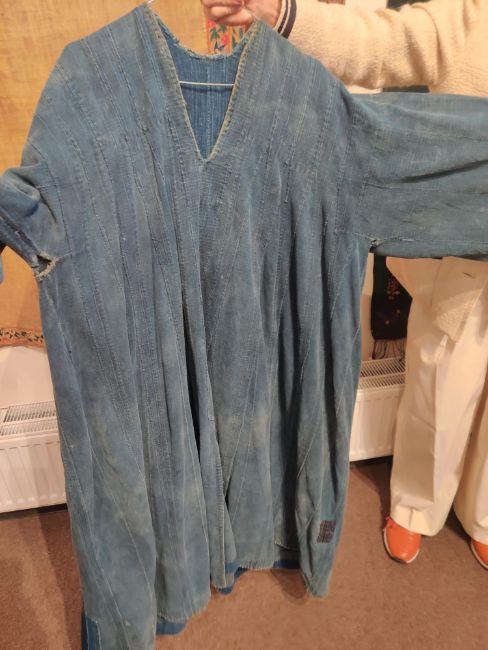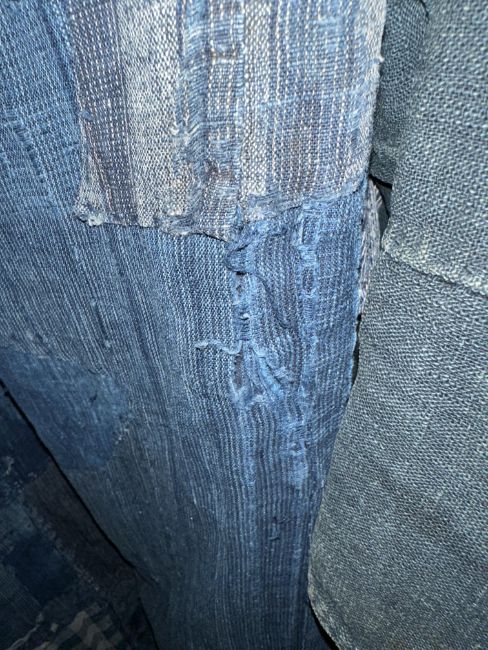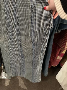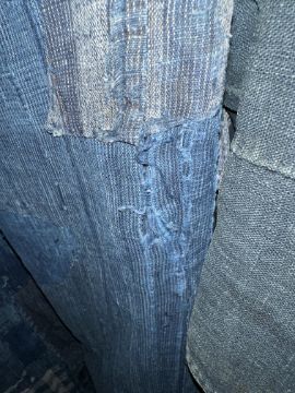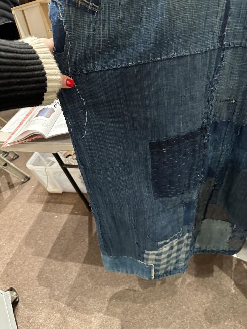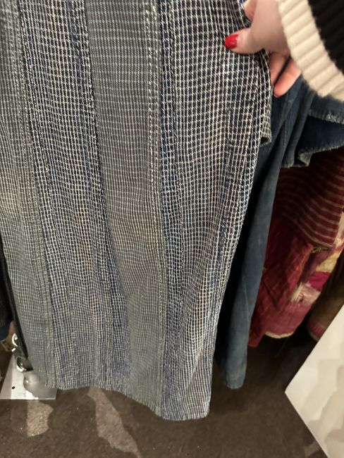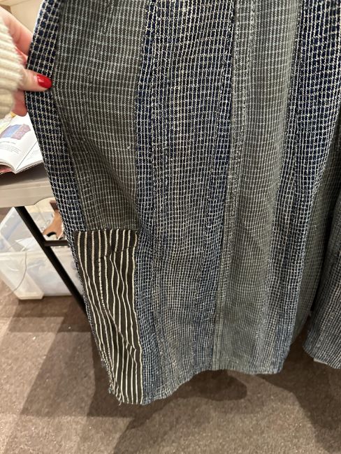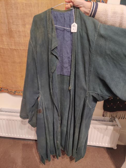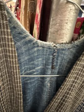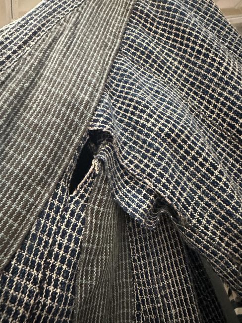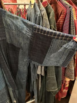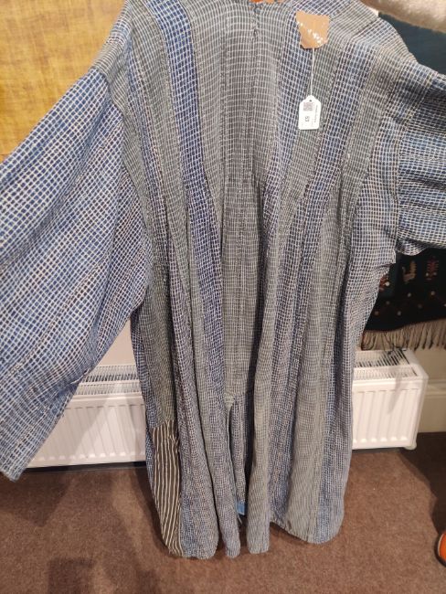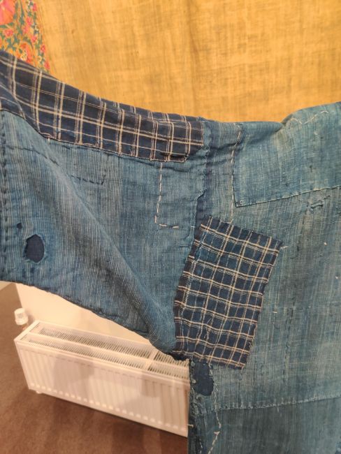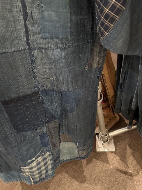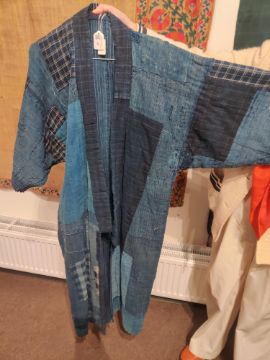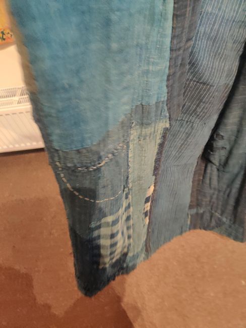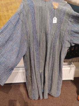 one plainweave kimono with button fastening, another striped with multiple patches of various indigo fabrics, one workdress in blue and white check with patches, the other indigo denim, approximate lengths 110cm, 130cm and 2 x 120cm (4)