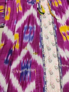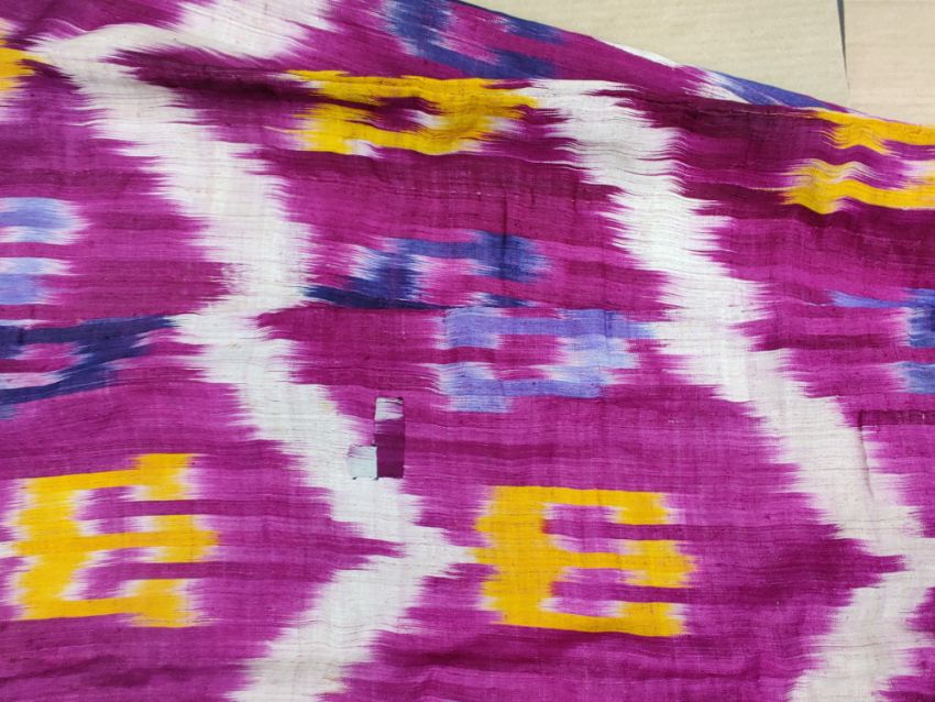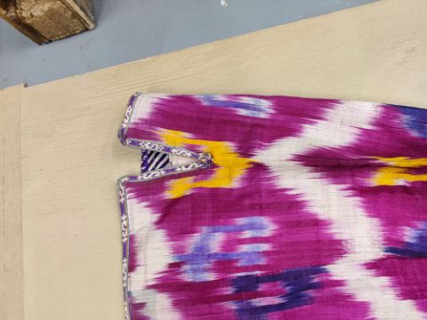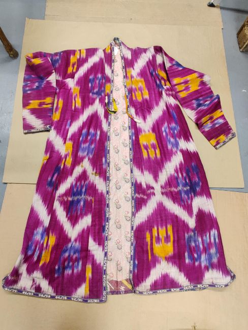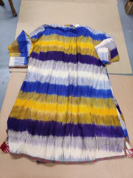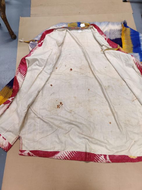 the striped with some spotting to upper back and front shoulder, lining with rust marks and spotting, (is plain, so perhaps worth replacing), otherwise in sound condition; the second with small patch (8cm x 4cm approx) on back skirt, minor spotting, lining and ikat generally in good condition