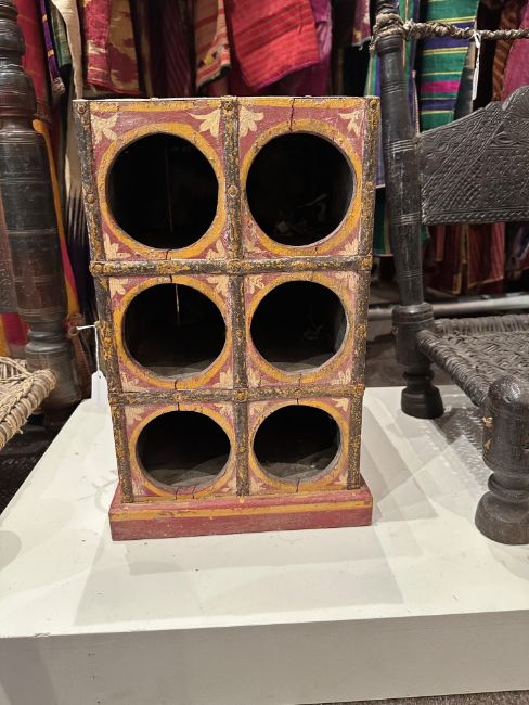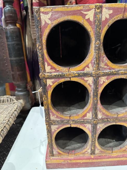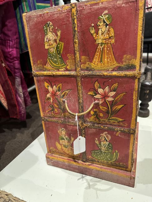 with six openings at the front, the twin handled sides decorated with flowers and male and female figures, iron mounts, 42.5 x 28 x 26cm