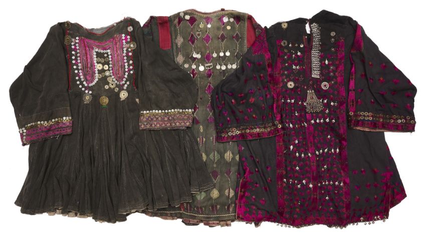 each decorated with silk embroidered geometric motifs, buttons, beads, coins, metal tokens, jewellery and amulets
