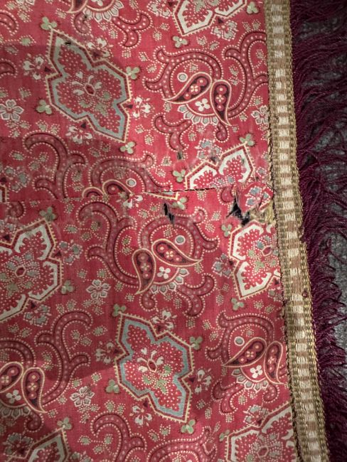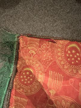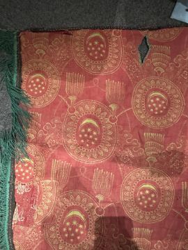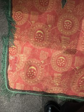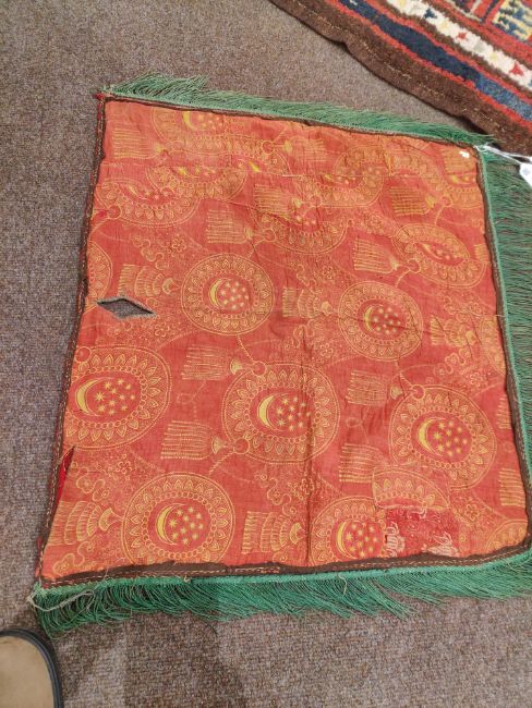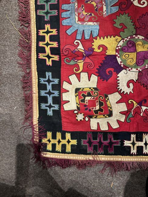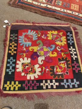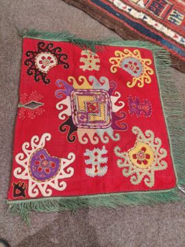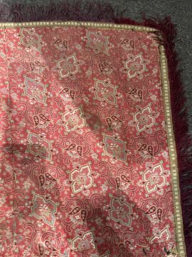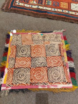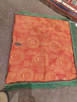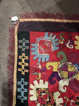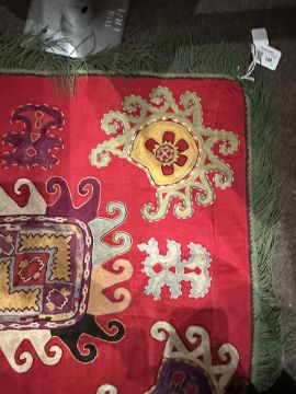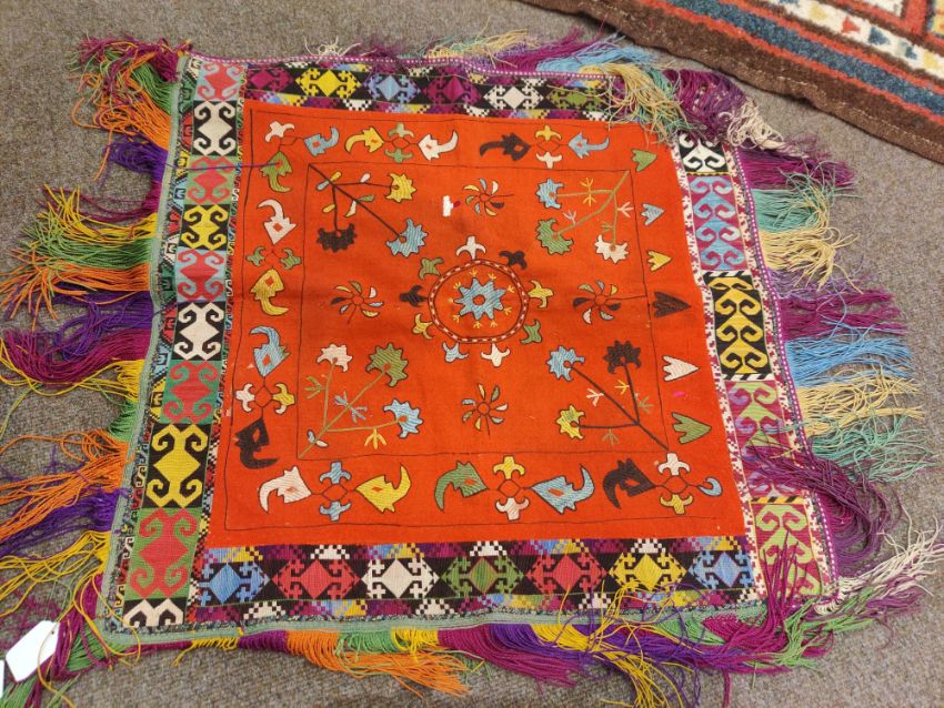 each of red woollen broadcloth embroidered in silk, with polychrome fringing, the largest 68 x 68cm (4)