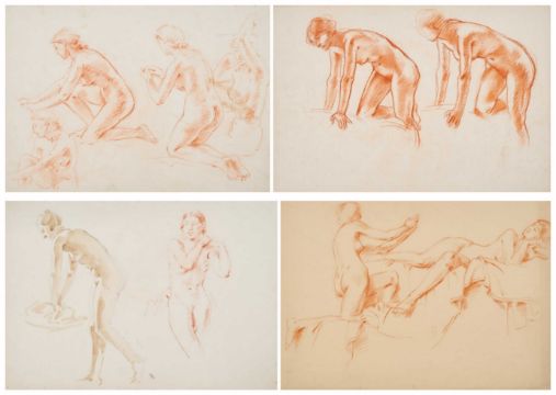 FOUR SKETCHES FROM LIFE: A KNEELING FEMALE NUDE (I); A NUDE LEANING FORWARD (II); TWO FEMALE NUDES, FRONT AND IN PROFILE (III); TWO NUDES WITH ONE RECLINIGN ON A DRAPE (IV)