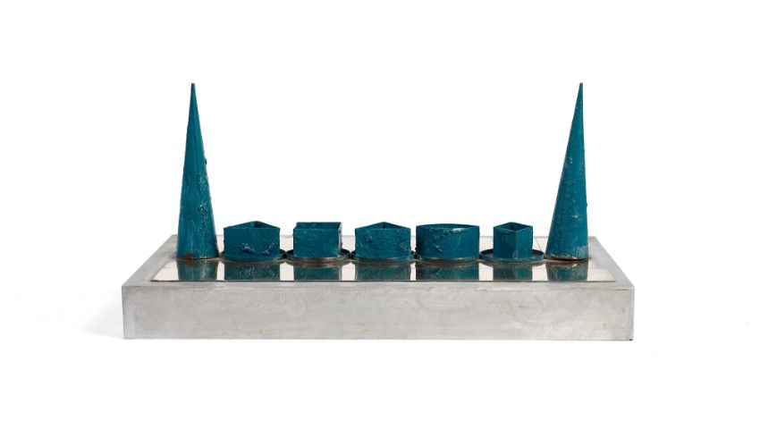signed Michael Kenny- 84. on the base lower right; further signed and dated Michael Kenny '84 on the underside of the base; titled, initialed and dated SHADOWS 1984 / MK on a label on the underside of the base; brass, aluminium and painted metal; height (including base): 19cm; 7 1/2in / length (including base): 38cm; 15in / width (including base): 24.5cm; 9 1/2in