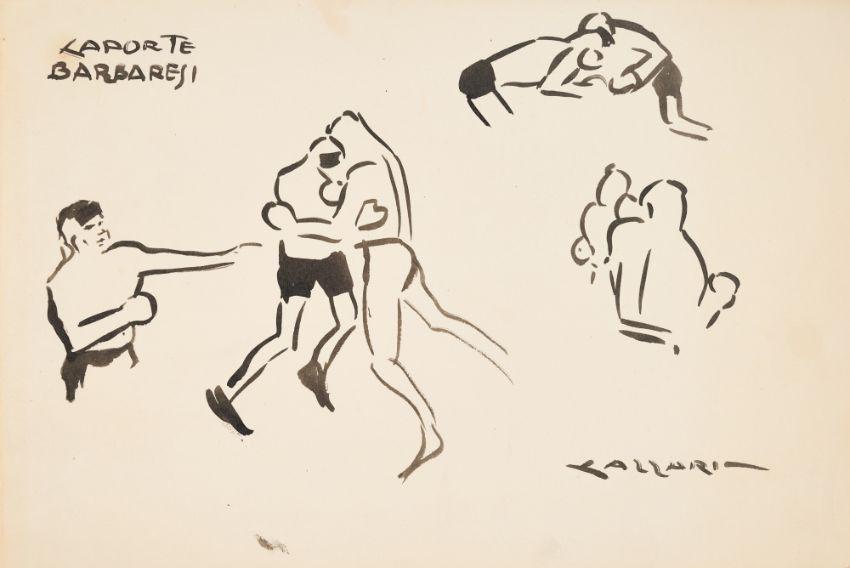 five signed LAZZARI; the three boxing sketches inscribed L'ARBITRO MAZZIA; BARBARESI LAPORTE and LAPORTE BARBARESI; each pen and ink on paper; various sizes (largest 32.5 x 22cm; 12 3/4 x 8 1/2in) (all unframed)