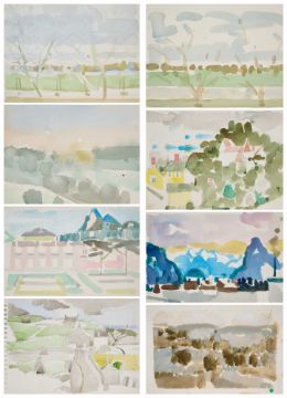 EIGHT STUDIES OF LANDSCAPES INCLUDING A COASTAL VILLAGE AND A COUNTRY HOUSE WITH FORMAL GARDENS