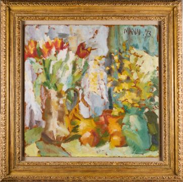 signed and dated MANN.73. upper right; signed and inscribed Oranges Tulips, / Mimosa, / Cyril Mann. on a label on the reverse; oil on board; 60 x 61cm; 23 3/4 x 24in (82.5 x 83cm; 32 1/2 x 32 3/4in framed)