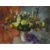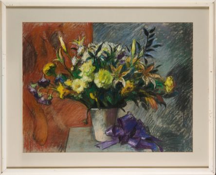 A STILL LIFE OF FLOWERS WITH LILIES IN A VASE AND PURPLE RIBBON