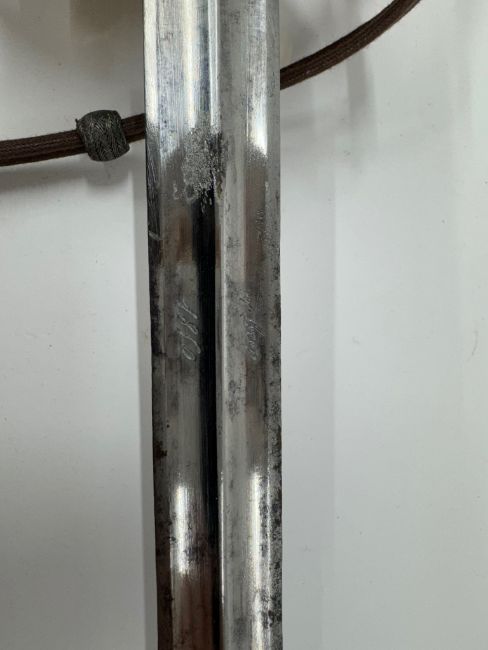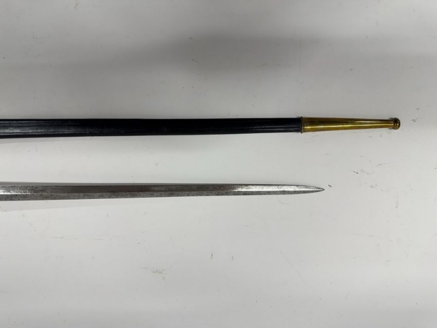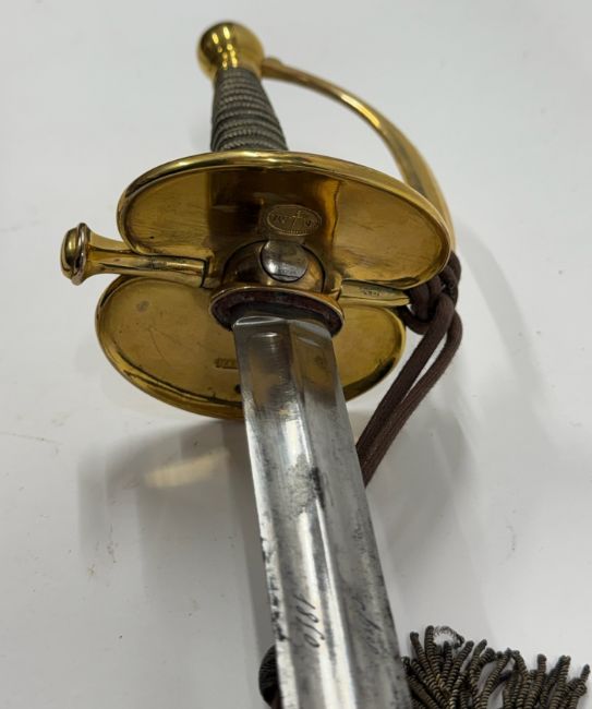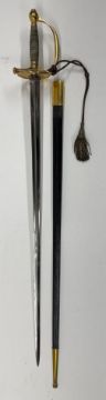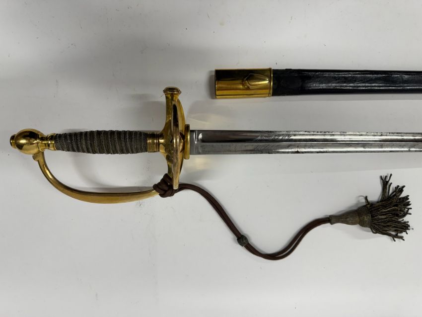 of regulation pattern, with bright fullered blade (some rust patination) etched with Chatellerault manufactory details on one side and dated on the other, ormolu hilt retaining nearly all it gilding, stamped ‘MANCEAUX’ on the inside and with applied Napoleonic eagle, folding inner-guard, silver wire bound grip, and retaining its brown cord and silver bullion sword-knot, in original black leather scabbard with ormolu locket and chape, 78.0 cm blade