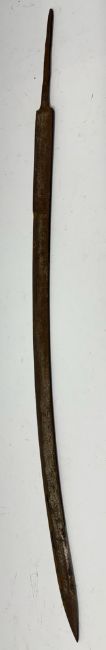 the first with fullered blade (pitted) retaining traces of etched decoration including a boar on one side and a stag on the other, copper-alloy hilt cast with foliage including shell-guard and domed pommel-cap, and rounded cow horn grips; the second with curved blade lightly etched with the figure of a pandour on each side, hilt with copper-alloy lobed recurved quillons and eagle-head pommel, and polished staghorn grip; together with three modern hangers, one incorporating parts of a plug bayonet, the blade etched later with crowned ‘WR’ cypher over ‘ANNO 1690’, and copper-alloy hilt engraved ‘FT 14 ‘ over ‘WILLIAM’, a modern copper-alloy hilted falchion, and an etched rusted sabre blade, the first: 56.5 cm blade (7)