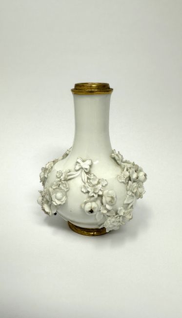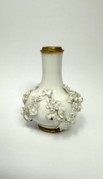 This type of white porcelain with distinctive flower swag decoration has been associated with a group of Meissen given to Queen Sophie Dorothea of Prussia in 1735, and to Maria Josepha, Electress of Saxony and Queen of Poland in 1738. J.J. Kändler's work records for 1735, 1738 and 1739 record pieces with ribbon tied flower decoration (see S. Wittwer, 'Liasons Fragile: Exchanges of Gifts between Saxony and Prussia in the Early Eighteenth Century', Fragile Diplomacy, 2007, p.101). Known pieces with this type of applied flower decoration are also distinguished by areas of gold ground, as seen on the interior of this bottle, gilt bands to the rims and in some cases purple camaieu landscape scenes. It is not known if this type of decoration was used exclusively for the royal gifts or whether further small services or pieces in this style were produced around the same time.