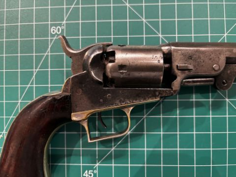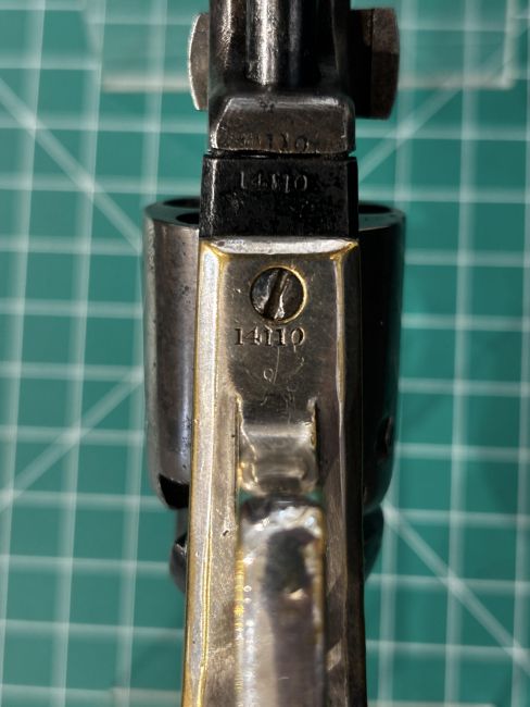of production specifications, the barrel with New York City address, the trigger-guard and back-strap retaining some original silvering and matching numbers (worn and some old pitting): in modern wooden case with some reproduction accessories, 12.7 cm barrel