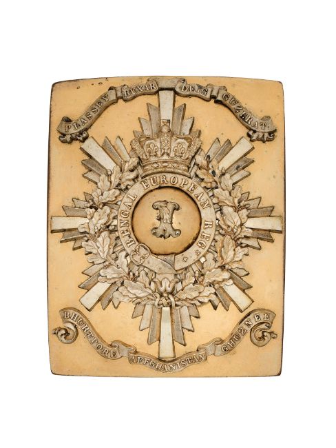 the rectangular burnished gilt plate (slight rubbing to gilt) mounted with a gilt rayed eight-pointed star surmounted by gilt crowned laurel wreath surrounding a gilt garter inscribed 'BENGAL EUROPEAN REGt', central burnished gilt raised roundel surmounted by floreated '1', scroll battle honours of 'PLASSEY', 'BUXAR', 'DEIG' and 'GUZERAT' to top, and 'BHURTPORE', 'AFGHANISTAN' and 'GHUZNEE' to bottom, two hooks and two studs to reverse, together with leather backing